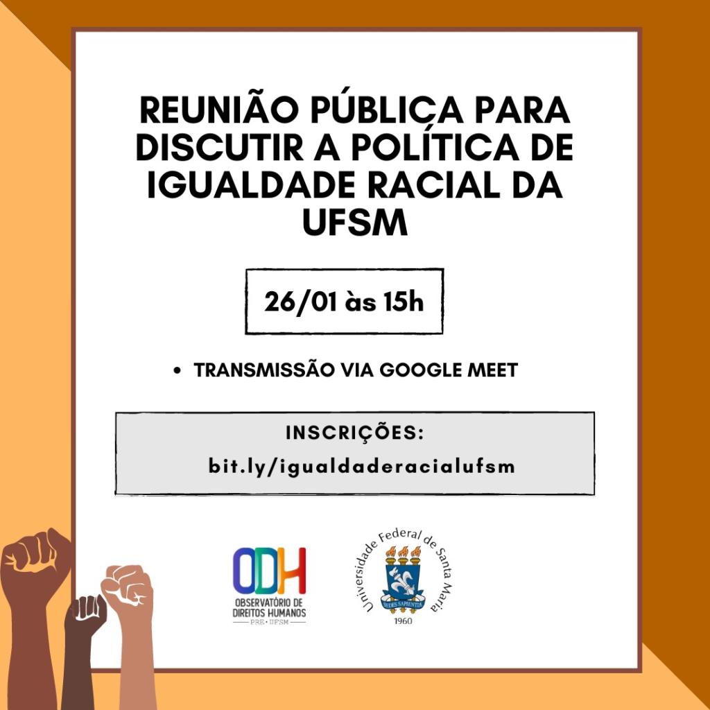 Convidamos a todos e a todas a participarem de uma reunião pública, via Google Meet, no próximo dia 26/01, às 15h, para pensarmos no que é importante constar na Política de Igualdade Racial da Universidade Federal de Santa Maria. Essa é uma primeira discussão de muitas que ainda virão para que possamos construir essa política com diálogo, amplitude e coesão.