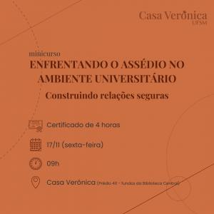 Casa Verônica UFSM, setor vinculado ao Observatório de Direitos Humanos (ODH) e à Pró-Reitoria de Extensão (PRE), promove, na próxima sexta (17), às 09h, a segunda edição da capacitação sobre prevenção ao assédio no contexto universitário. O minicurso é voltado para os Diretórios Acadêmicos (DA) da Universidade e bolsistas de projetos fomentados pelo ODH.