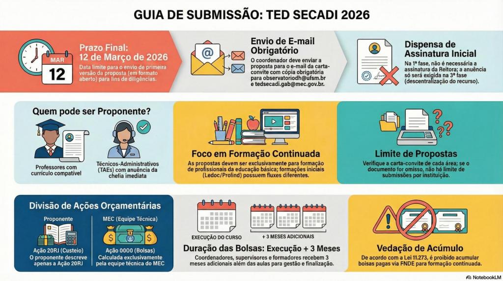 No início de março, a UFSM recebeu dez cartas-convite da SECADI para submissão de propostas de cursos de formação inicial e continuada, além de eventos educacionais. As diretrizes seguem a Portaria nº 10/2026, que estabelece critérios e indicadores de monitoramento para apoio técnico e financeiro às instituições federais de ensino.