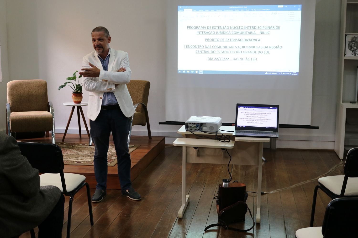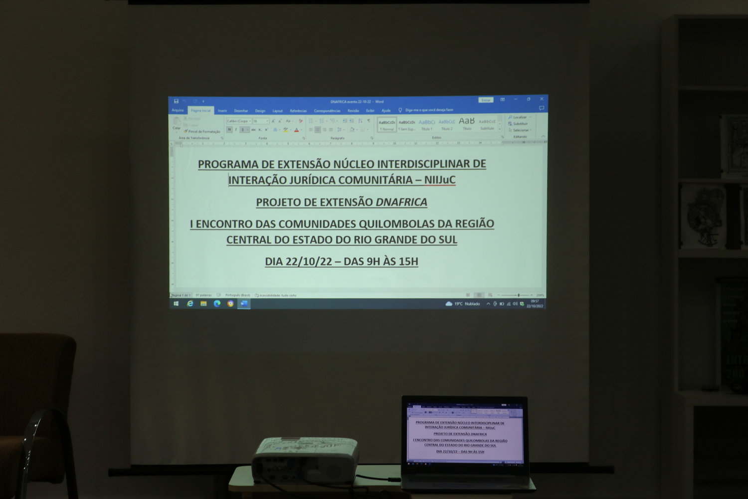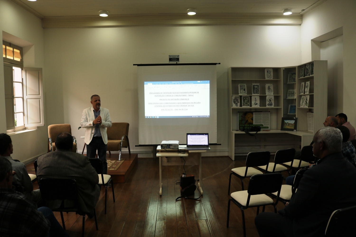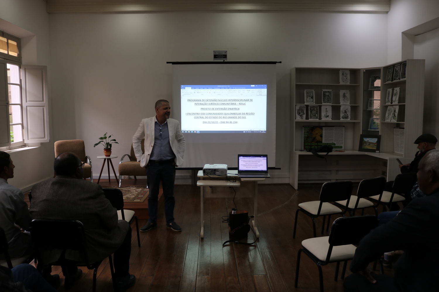 Na oportunidade, foram discutidos problemas atinentes à falta de efetivação de Políticas Públicas para as comunidades negras, que vivenciam a exclusão e invisibilidade, especialmente em contextos de etnias predominantemente europeias. Reuniram-se lideranças de todas as 16 comunidades quilombolas, dos municípios da Quarta Colônia (Restinga Seca, Nova Palma, Dona Francisca, São João do Polêsine e Faxinal do Soturno), além de Formigueiro, São Sepé e Santa Maria. Também estiveram presentes os dirigentes do Conselho de Desenvolvimento Negro do RS, Sr. Márcio Luis Rosa de Oliveira, e da ONG Instituto de Assessoria às Comunidades Remanescentes de Quilombo, Sr. Ubirajara carvalho Toledo, bem como a artista plástica Raianny Silva, liderança da ocupação Vila Resistência, que falou em nome da Teia dos Povos. O evento é foi uma promoção do Projeto DNÁfrica, lotado no Espaço Multidisciplinar, e vinculado ao Programa de Extensão Núcleo Interdisciplinar de Interação Jurídica Comunitária – NIIJuC, coordenado pelo Prof. Dr.José Luiz de Moura Filho, do Departamento de Direito, e composto, dentre outros, pelos alunos de Pós-Doutorado João Heitor Silva Macedo, responsável pela palestra Contesto Histórico, Beatriz Pontes, doutoranda em Ciências Sociais, dos graduandos Gabriel Soares (Direito) e Willian Silva (Jornalismo).