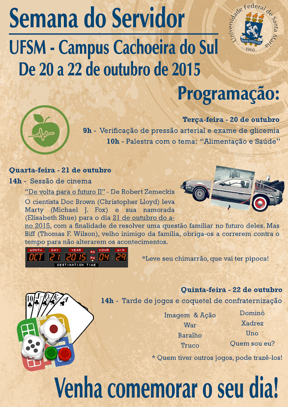 As atividades do Semana do Servidor no campus de Cachoeira do Sul acontecem de 20 a 22 de outubro de 2015 com diversas atividades programadas pela campus: palestra sobre alimentaçaõ e saúde, verificação de pressão arterial e glicemia, sessão de cinema, tarde de jogos e coquetel de confraternização.