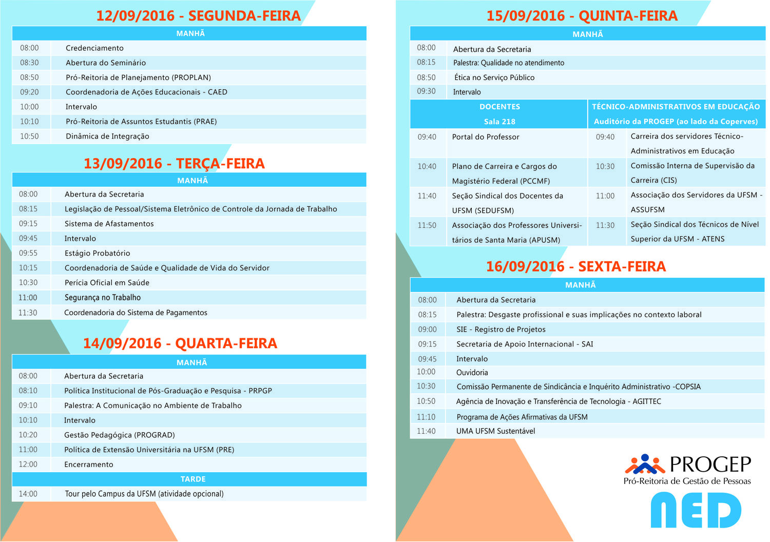 Nos dias 12 a 16 de setembro de 2016, o Núcleo de Educação e Desenvolvimento da Pró-Reitoria de Gestão de Pessoas (NED/PROGEP) realizou o Seminário de Recepção e Integração Institucional para Novos Servidores Docentes e Técnico-administrativos em Educação da UFSM.