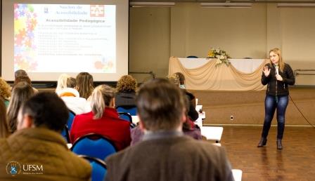 A Palestra foi ministrada por Fabiane Vanessa Breitenbach. A palestrante atualmente é doutoranda pelo Programa de Pós-Graduação em Educação – PPGE/UFSM na Linha de Pesquisa de Educação Especial. Desde janeiro de 2013, exerce a função de Técnica em Assuntos Educacionais na UFSM, vinculada à Reitoria, atuando juntamente ao Núcleo de Acessibilidade.