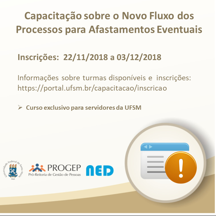 O Núcleo de Educação e Desenvolvimento (NED) da Pró-Reitoria de Gestão de Pessoas informa que estão