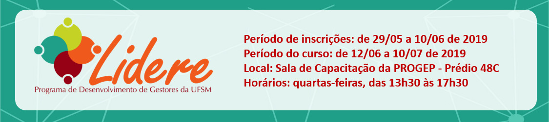 A Pró-Reitoria de Gestão de Pessoas informa que estão abertas as inscrições, até o dia 11/06 de 2019, para o LIDERE – Programa de Desenvolvimento de Gestores da UFSM, que tem como objetivo contribuir para o aprimoramento da dinâmica organizacional, nos aspectos referentes à liderança e gestão de pessoas, tendo em vista a melhoria da qualidade de vida no ambiente de trabalho, as relações interpessoais, o desempenho profissional e consequentemente uma melhor prestação de serviços à comunidade.