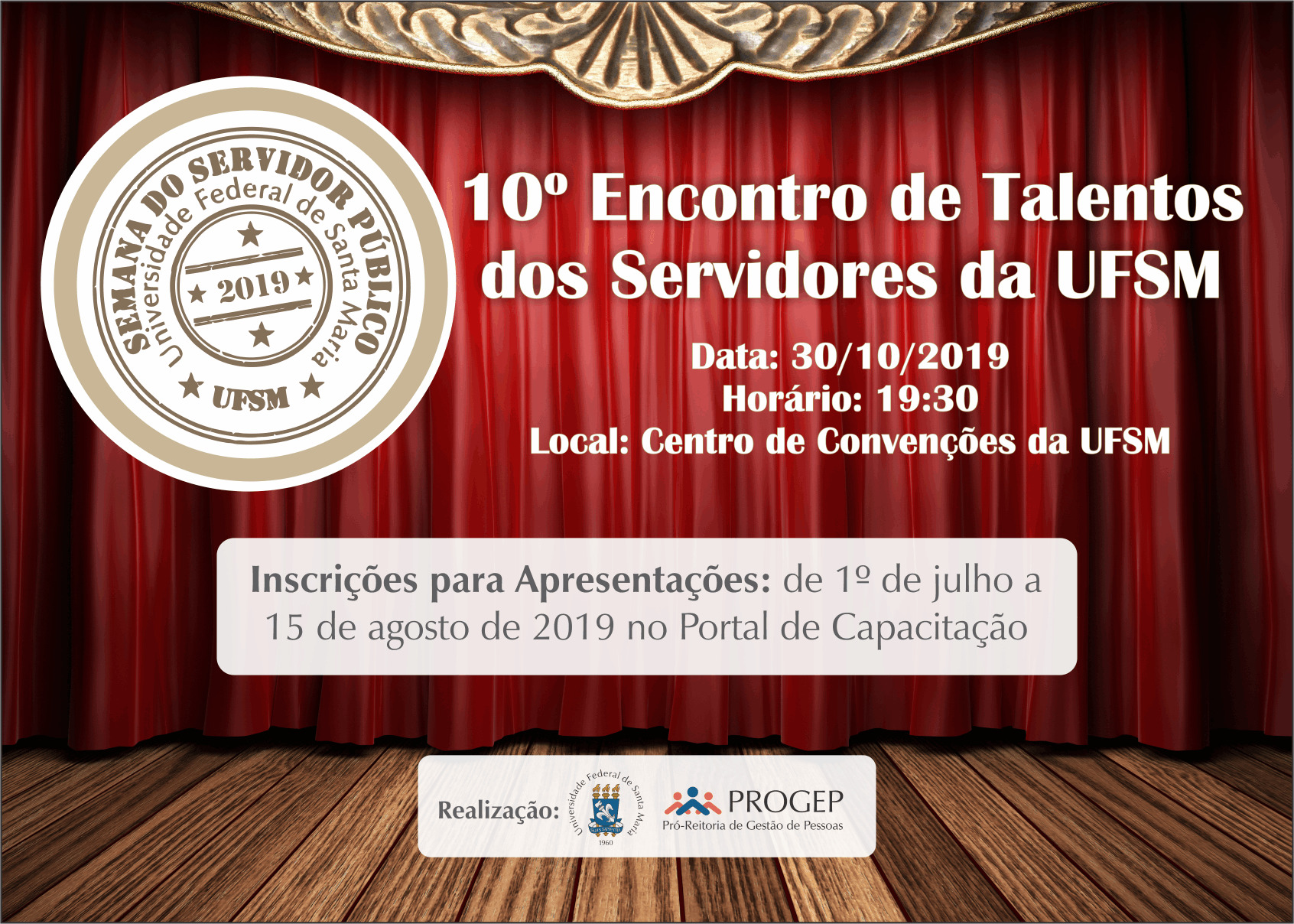 O Núcleo de Educação e Desenvolvimento da Pró-Reitoria de Gestão de Pessoas informa que de 1º de julho a 15 de agosto de 2019 estarão abertas as inscrições para os servidores que desejam se apresentar no 10º Encontro de Talentos dos Servidores da UFSM.