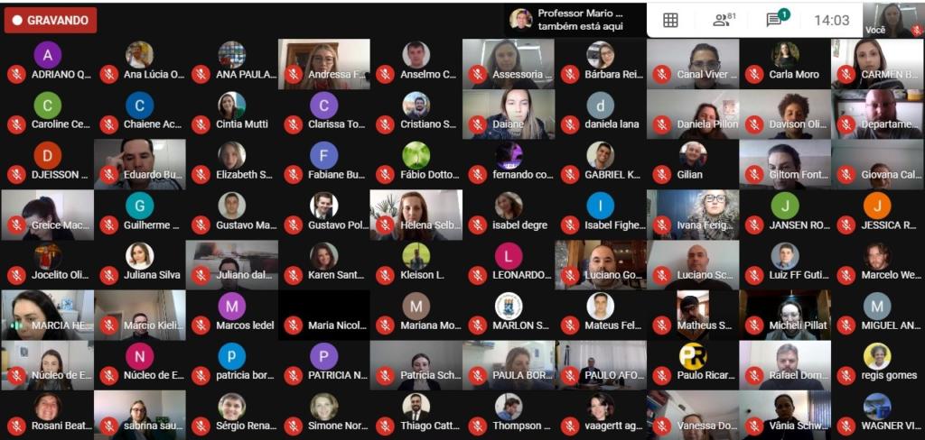 O encontro virtual de abertura contou com a presença do Prof. Paulo Afonso Burmann, Reitor da UFSM, do Prof. Luciano Schuch, Vice-Reitor da UFSM, e da Pró-Reitora de Gestão de Pessoas, Adm. Marcia Lorentz, que deram as boas-vindas aos novos servidores, ressaltando a importância de cada um para o desenvolvimento da Instituição.