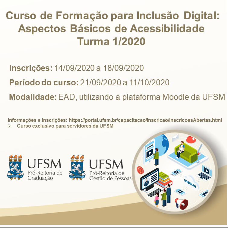Visando incentivar a capacitação dos seus servidores, neste momento de suspensão das atividades presenciais, a UFSM, informa que estão abertas as inscrições para o Curso de Formação para Inclusão Digital: Aspectos Básicos de Acessibilidade, a qual tem como objetivo capacitar os/as servidores/as da Instituição para uma atuação inclusiva com o uso, predominantemente, de artefatos digitais, sendo uma das capacitações relacionadas à formação dos docentes dentro do escopo da UFSM em Rede.
