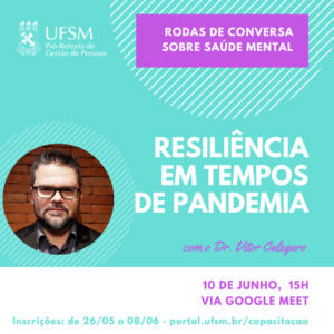 A Pró-Reitoria de Gestão de Pessoas (PROGEP) da Universidade Federal de Santa Maria (UFSM) informa que estão abertas as inscrições para a Roda de Conversa sobre Resiliência em Tempos de Pandemia, que ocorrerá no dia 10/06/2021, das 15h às 17h, via Google Meet.