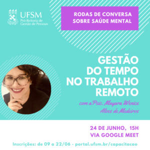 A Pró-Reitoria de Gestão de Pessoas (PROGEP) da Universidade Federal de Santa Maria (UFSM) informa que estão abertas as inscrições para a Roda de Conversa sobre Gestão do Tempo no Trabalho Remoto, que ocorrerá no dia 24/06/2021, das 15h às 17h, via Google Meet.
