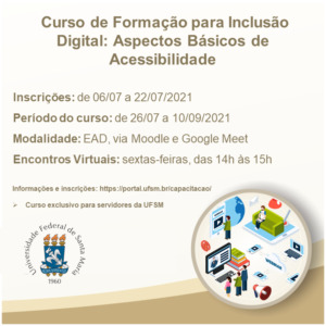 A Universidade Federal de Santa Maria informa que estão abertas as inscrições para o Curso de Formação para Inclusão Digital: Aspectos Básicos de Acessibilidade, o qual tem como objetivo capacitar os(as) servidores(as) da Instituição para uma atuação inclusiva com o uso, predominantemente, de artefatos digitais, sendo uma das capacitações relacionadas à formação dos docentes dentro do escopo da UFSM em Rede.