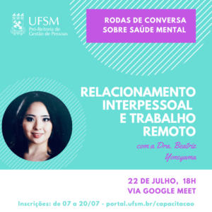 A Pró-Reitoria de Gestão de Pessoas (PROGEP) da Universidade Federal de Santa Maria (UFSM) informa que estão abertas as inscrições para a Roda de Conversa sobre Relacionamento Interpessoal e Trabalho Remoto, que ocorrerá no dia 22/07/2021, das 18h às 20h, via Google Meet.