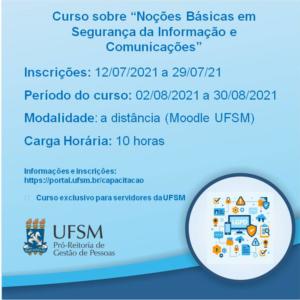 A Universidade Federal de Santa Maria (UFSM), por meio da Pró-Reitoria de Gestão de Pessoas (PROGEP), informa que estão abertas as inscrições para Curso sobre Noções Básicas em Segurança da Informação e Comunicações,  o qual tem como objetivo orientar os servidores sobre o que é Segurança da Informação e Comunicações, fazendo com que os participantes saibam aplicar os conhecimentos em sua rotina pessoal e profissional .
