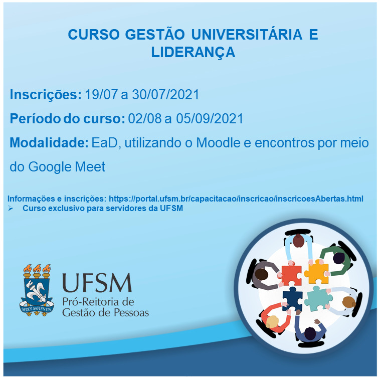 Visando incentivar a capacitação dos seus servidores, a Universidade Federal de Santa Maria (UFSM), por meio da Pró-Reitoria de Gestão de Pessoas (PROGEP), informa que estão abertas as inscrições para o Curso Gestão Universitária e Liderança – Turma 1/2021, o qual tem como objetivo refletir e debater sobre a gestão de universidades públicas e o papel de líder exercido pelos gestores em um contexto de mudanças, fazendo parte da Trilha de Desenvolvimento de Gestores da UFSM.