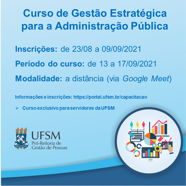 A Universidade Federal de Santa Maria (UFSM), por meio da Pró-Reitoria de Gestão de Pessoas (PROGEP), informa que estão abertas as inscrições para o Curso de Gestão Estratégica para a Administração Pública, o qual tem como objetivo o nivelamento do conhecimento e a troca de experiências quanto ao processo de implementação da gestão estratégica numa Instituição Pública de Ensino.