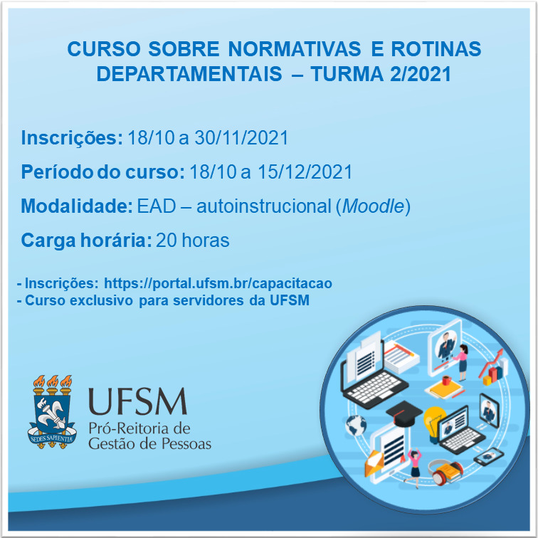 A Universidade Federal de Santa Maria (UFSM), por meio da Pró-Reitoria de Gestão de Pessoas (PROGEP), informa que estão abertas as inscrições para o Curso sobre Normativas e Rotinas Departamentais – Turma 1/2021, o qual objetiva que os secretários e chefes de Departamentos Didáticos tenham conhecimento das principais rotinas e normativas necessárias ao exercício diário da função, permitindo maior autonomia, celeridade nos processos e tomada de decisão de forma assertiva.