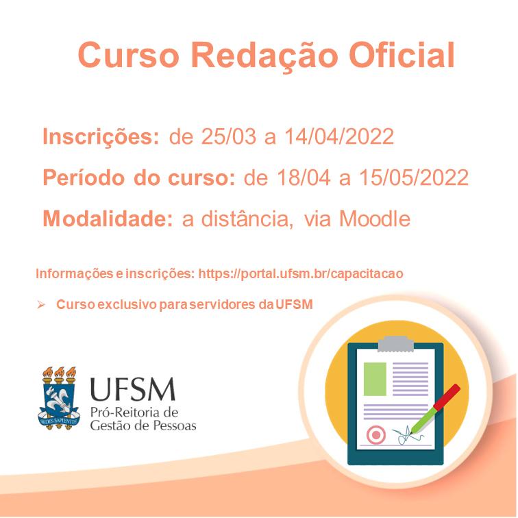 A Pró-Reitoria de Gestão de Pessoas informa que estão abertas as inscrições para o Curso de Redação Oficial – Turma 1/2022, o qual tem como objetivo fomentar o interesse dos servidores docentes e técnico-administrativos da Universidade Federal de Santa Maria pela Redação Oficial, estimulando a produção e a troca de saberes que contribuam para as rotinas de comunicação institucional, tornando-as mais ágeis, objetivas, integradas e padronizadas.