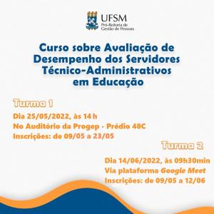 A Universidade Federal de Santa Maria (UFSM), por meio da Pró-Reitoria de Gestão de Pessoas (PROGEP), informa que estão abertas as inscrições para a Capacitação sobre Avaliação de Desempenho dos Servidores Técnico-Administrativos em Educação, a qual tem como objetivo desenvolver o processo pedagógico da Avaliação de Desempenho, que, neste ano, ocorre no período de 02 de maio a 1º de julho.