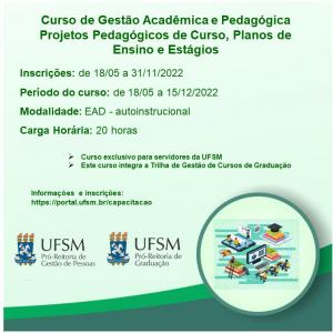 Os cursos são uma parceria entre a Pró-Reitora de Graduação (PROGRAD) e a Pró-Reitora de Gestão de Pessoas (PROGEP) e serão realizados no período de 18/05 a 15/12/2022, na modalidade a distância (autoinstrucional via Moodle), totalizando 20h/aula cada.