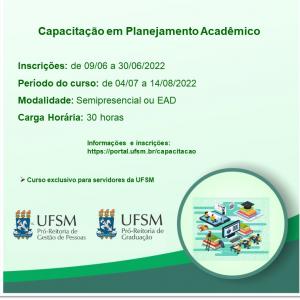 A Pró-Reitoria de Gestão de Pessoas (Progep) e a Pró-Reitoria de Graduação (Prograd) informam que estão abertas as inscrições para o Curso de Capacitação em Planejamento Acadêmico, o qual tem como objetivo capacitar as coordenações e secretarias de curso, bem como as chefias e secretarias de departamentos didáticos, auxiliando na resolução dos problemas acadêmicos, através da implantação de um sistema integrado de troca de informações entre a Prograd e as unidades, orientando a respeito dos demais órgãos de apoio acadêmico, seus processos e fluxos.