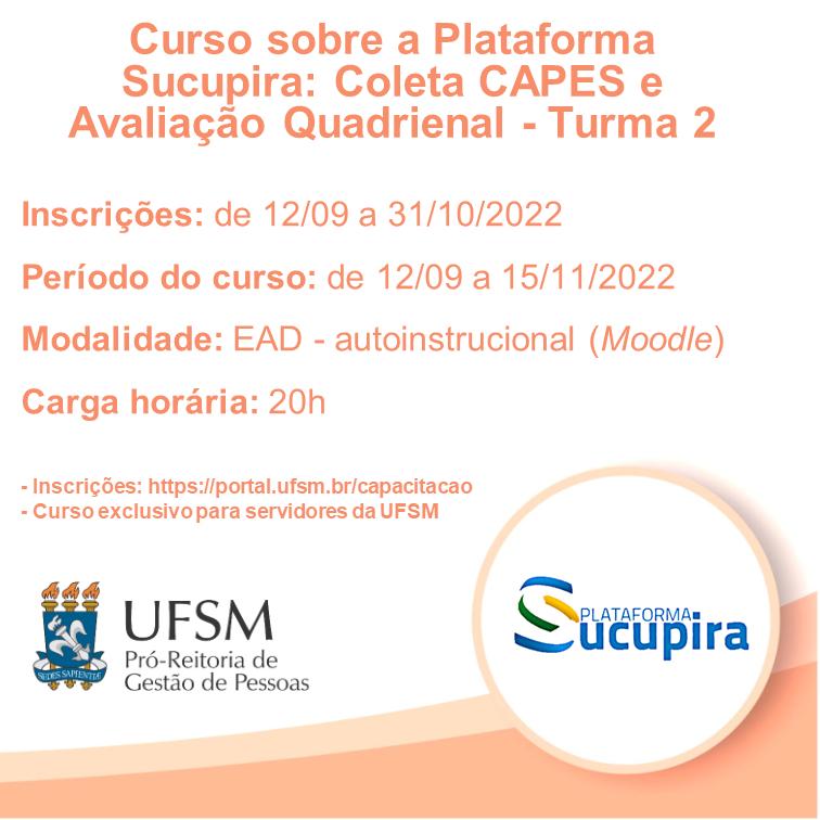 A Pró-Reitoria de Gestão de Pessoas (PROGEP) informa que estão abertas as inscrições para o Curso sobre a Plataforma Sucupira: Coleta CAPES e Avaliação Quadrienal – Turma 2/2022, que tem como objetivo capacitar os Coordenadores e os Secretários de cursos de Pós-Graduação da UFSM para atuarem no planejamento e na execução das atividades correspondentes ao preenchimento da Plataforma Sucupira, com ênfase na qualidade das informações e Avaliação Quadrienal da CAPES.
