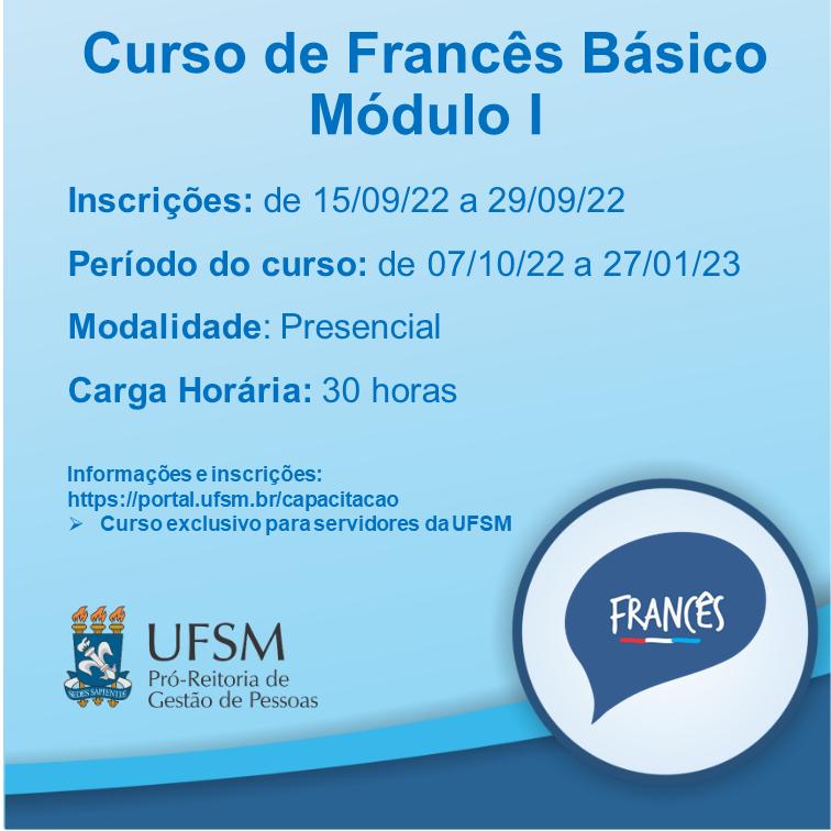 A Pró-Reitoria de Gestão de Pessoas informa que estão abertas as inscrições para o Curso de Francês Básico – Módulo I, o qual tem como objetivo fornecer formação em língua francesa aos servidores da UFSM por meio de uma abordagem comunicativa e estratégias de ensino diversificadas e, assim, desenvolver nos alunos a capacidade de leitura e comunicação em língua francesa com a finalidade de oportunizar-lhes o acesso ao conhecimento deste idioma.