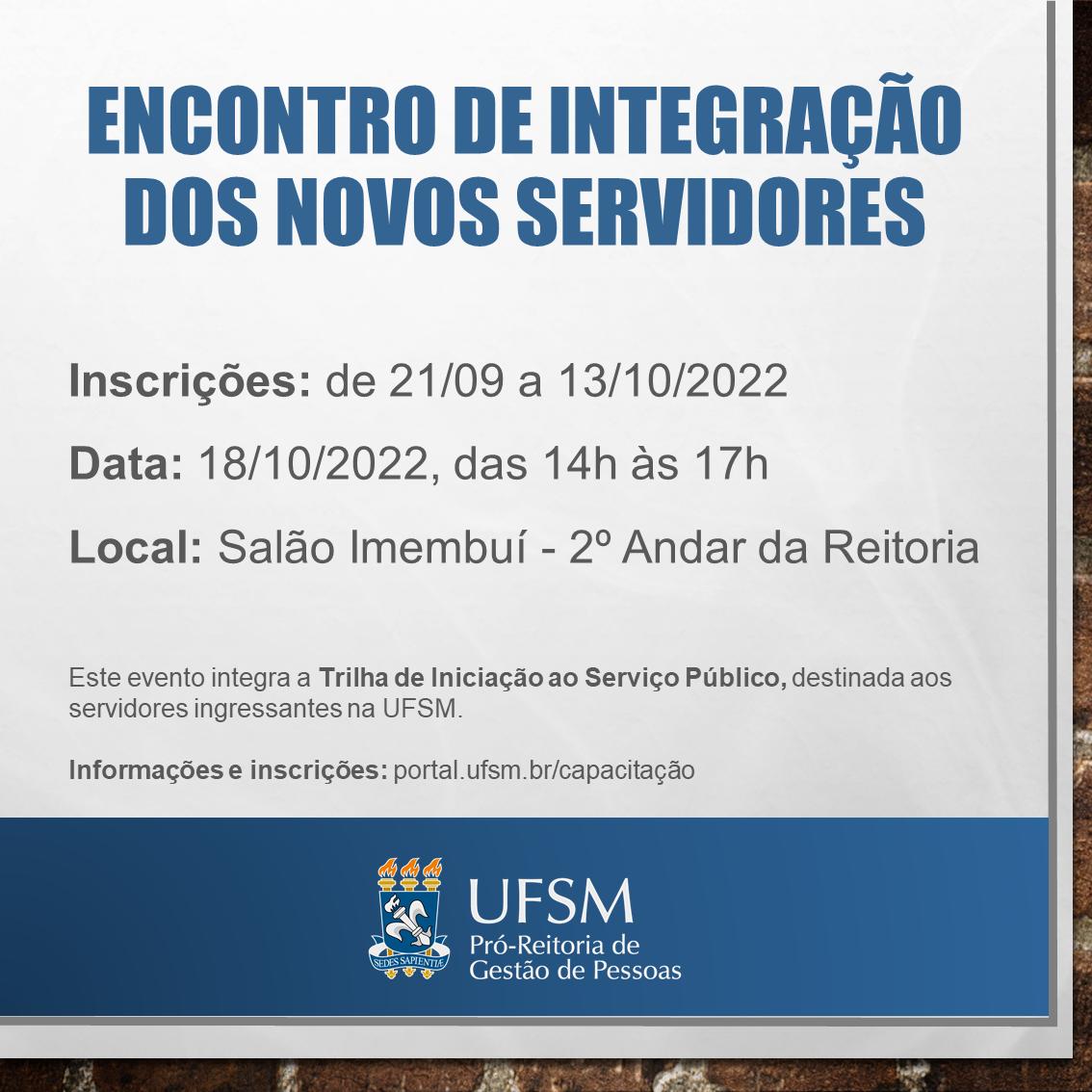 informa que estão abertas as inscrições para o Encontro de Integração dos Novos Servidores – Turma 02/2022. O objetivo do encontro é promover a integração dos servidores ingressantes na UFSM, proporcionando um momento de acolhimento e reflexão acerca do seu papel enquanto servidor público.