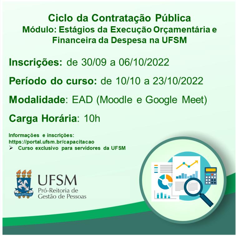 Ciclo da Contratação Pública – Módulo Estágios da Execução Orçamentária e Financeira da Despesa na UFSM, o qual tem como objetivo capacitar os servidores para realizar atividades pertinentes à execução orçamentária da despesa, com ênfase nos estágios da despesa pública: empenho, liquidação e pagamento.