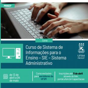 A Pró-Reitoria de Gestão de Pessoas (Progep) informa que estão abertas as inscrições para o Curso de Sistema de Informações para o Ensino – SIE – Sistema Administrativo, o qual tem como objetivo capacitar os servidores da UFSM para trabalhar elementos da Gestão Administrativa no SIE, utilizando os recursos computacionais disponíveis de software.