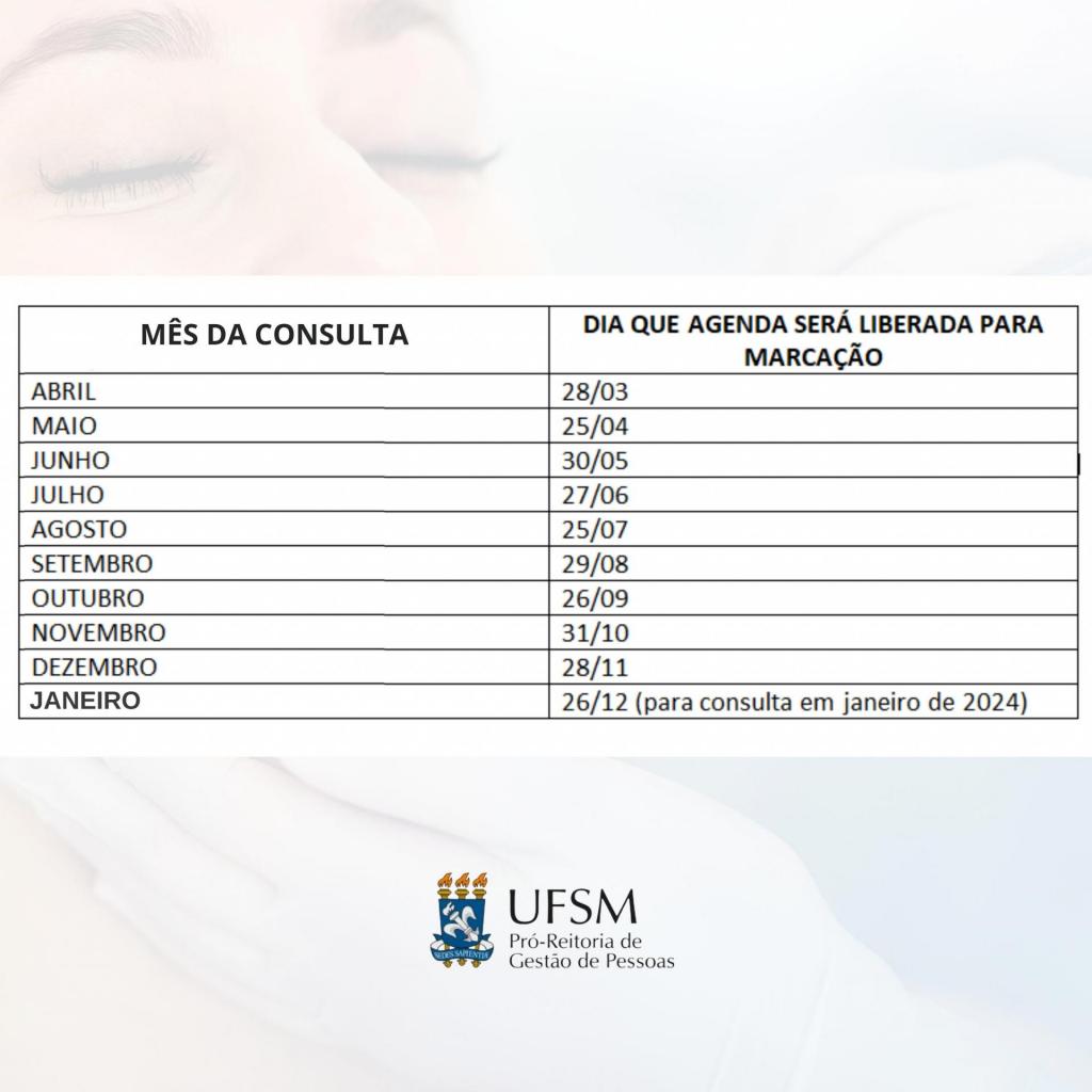 A agenda eletrônica será liberada sempre na última terça-feira do mês anterior, a partir das 8 horas, conforme cronograma a seguir: