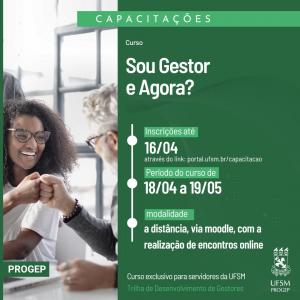 Com o objetivo de capacitar os gestores acerca dos aspectos legais e das melhores práticas relacionadas à área de gestão de pessoas, especialmente aquelas que influenciam a vida funcional dos servidores na Instituição, a Progep está lançando o Curso “Sou Gestor, e Agora?”.