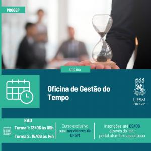 A Pró-Reitoria de Gestão de Pessoas informa que estão abertas as inscrições para a Oficina de Gestão do Tempo. A ação tem como objetivo proporcionar reflexões sobre a gestão do tempo na vida pessoal e profissional, bem como apresentar técnicas e ferramentas de gestão do tempo.
