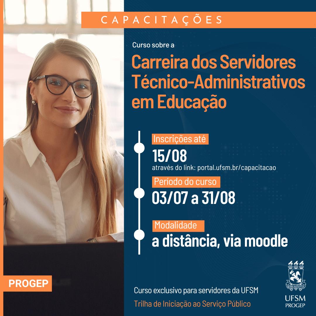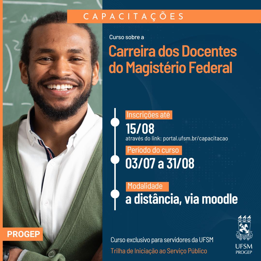 A Pró-Reitoria de Gestão de Pessoas (Progep), por meio do Núcleo de Educação e Desenvolvimento (NED), informa que estão abertas as inscrições para os Cursos sobre a Carreira dos Docentes do Magistério Federal e sobre a Carreira dos Servidores Técnico-Administrativos em Educação, os quais são promovidos com a finalidade de orientar os servidores acerca da sua carreira, abordando aspectos legais e normativos e possibilitando que os servidores possam planejar o seu desenvolvimento.