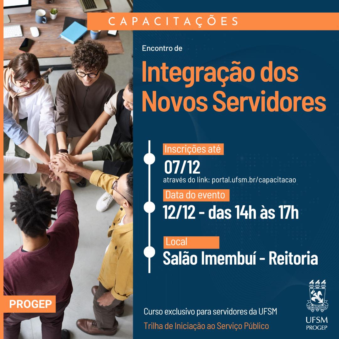 nforma que estão abertas as inscrições para o Encontro de Integração dos Novos Servidores – Turma 02/2023. O objetivo do encontro é promover a integração dos servidores ingressantes na UFSM, proporcionando um momento de acolhimento e reflexão acerca do seu papel enquanto servidor público.
