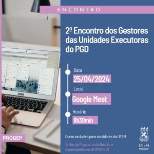 A Pró-Reitoria de Gestão de Pessoas promoverá o 2º Encontro dos Gestores das Unidades Executoras do PGD.
