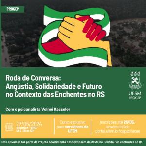 Nesse sentido, a Pró-Reitoria de Gestão de Pessoas visa fornecer, por meio de atividades, suporte aos servidores da UFSM, ajudando-os no fortalecimento dos laços sociais e na capacidade coletiva de enfrentamento de desastres. A primeira atividade prevista é a Roda de Conversa: Angústia, solidariedade e futuro no contexto das enchentes no RS, com o psicanalista Volnei Dassoler. Volnei é Doutor em Psicologia Social e Institucional, coordenador do Santa Maria Acolhe, serviço SUS de atenção à crise em Saúde Mental. Atuou nas tragédias da Kiss, Brumadinho e no Vôo da Chapecoense. A atividade busca abrir espaço para narrativas e testemunhos de como estamos vivendo o impacto emocional das enchentes no cotidiano coletivo e na vida subjetiva.