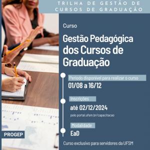 Trata-se de uma ação que visa capacitar os(as) servidores(as) da Instituição para a gestão pedagógica dos cursos de graduação apresentando os