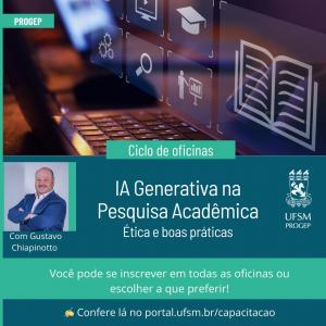 A Pró-Reitoria de Gestão de Pessoas (PROGEP), por meio do Núcleo de Educação e Desenvolvimento (NED), convida os servidores da UFSM para o ciclo de oficinas “IA Generativa e Pesquisa Acadêmica: Ética e Boas Práticas”. A iniciativa tem como objetivo capacitar os participantes para o uso ético, responsável e transparente da Inteligência Artificial Generativa (IAG) na produção científica.
