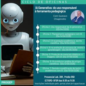 A Universidade Federal de Santa Maria (UFSM) promoverá, entre os meses de abril e maio de 2026, um Ciclo de Oficinas sobre Inteligência Artificial Generativa, voltado a docentes e profissionais da educação interessados em compreender e aplicar essas tecnologias de forma crítica, ética e pedagógica.