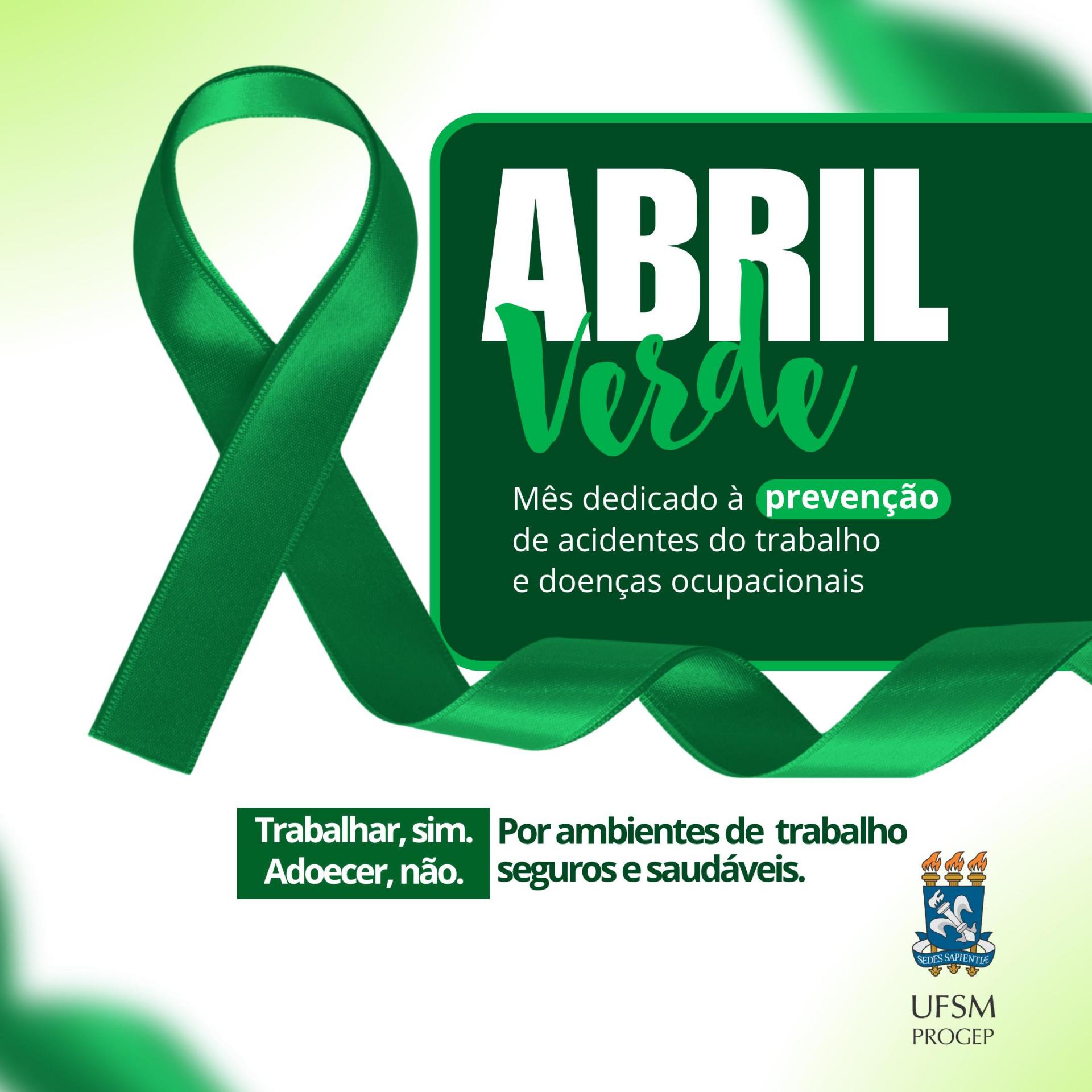 Durante o mês de abril, a Coordenadoria de Saúde e Qualidade de Vida do Servidor (CQVS/PROGEP) está desenvolvendo ações de conscientização relacionadas ao Abril Verde. A data é alusiva ao Dia Mundial da Segurança e Saúde no Trabalho (28 de abril), promovido pela Organização Internacional do Trabalho (OIT), reforçando a necessidade de fortalecer políticas de prevenção e promoção da saúde laboral.