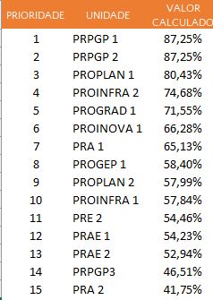 Resultado da aplicação do questionário sobre e a avaliação qualitativa dos resultados. Os valores em percentual revelam a ordem de atendimento ás demandas das pró-reitorias e suas subunidades.
