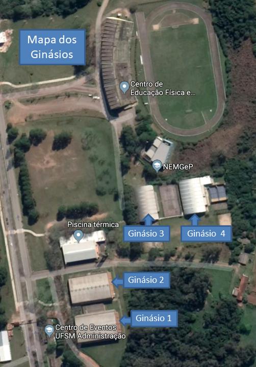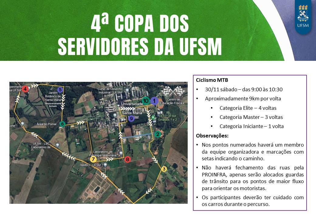 | Ciclismo MTB | 📅 Dia 30/11 – 09:00 | 🚩Trajeto – Campus UFSM | 📃Regulamento | 📄Inscritos Ciclismo | Colocação Final |