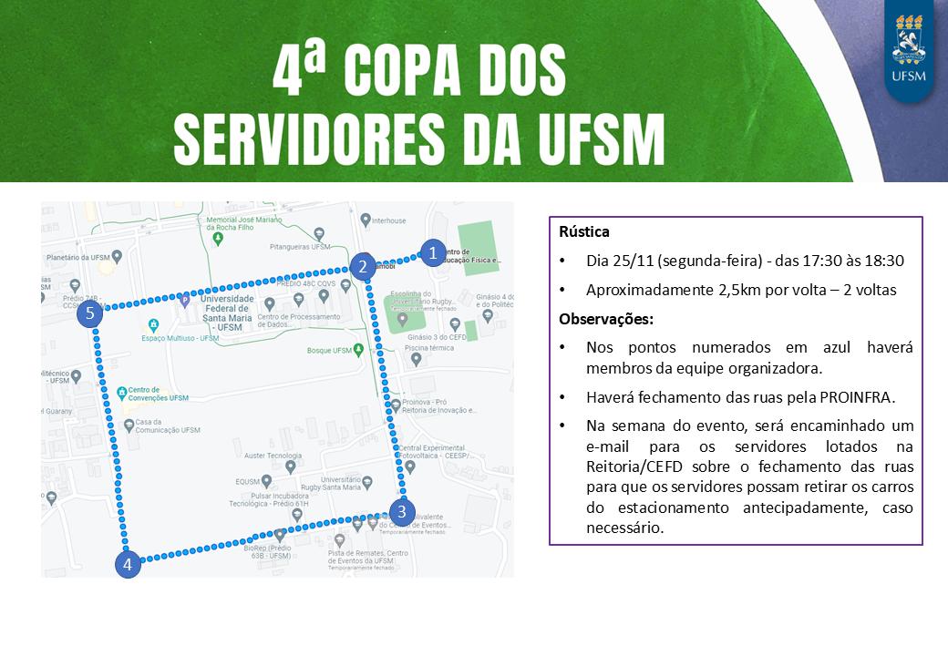 | Rústica | 📅 Dia 25/11 – 17:30 | 🚩Trajeto – Campus UFSM | 📃Regulamento | 📄Inscritos Rústica | Colocação Final |