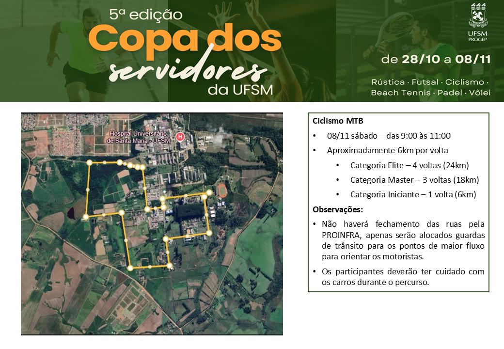 | Ciclismo MTB | 📅 08/11 – 09:00 | 🚩Trajeto Atualizado – UFSM | 📃Regulamento | ✍🏽Individual | Colocação Final |
