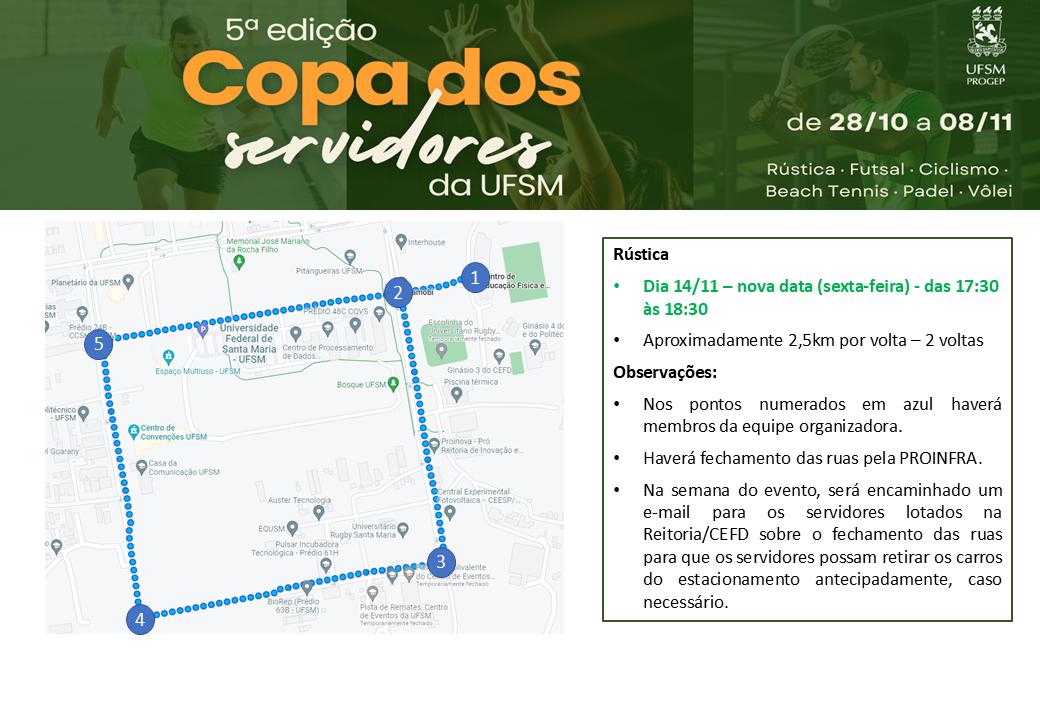 | Rústica | 📅⚠️Nova data: 14/11 – 17:30 | 🚩Trajeto – UFSM | 📃Regulamento | ✍🏽Individual | Colocação Final |