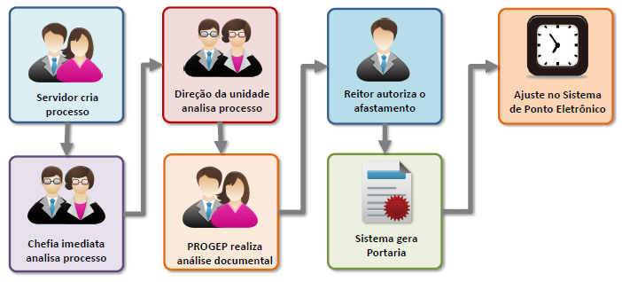 A tramitação ocorre conforme figura abaixo, sendo que todas as instâncias, pelas quais tramita o processo do servidor, possuem competência para deferi-lo ou indeferi-lo de acordo com o interesse da Administração Pública e da UFSM.