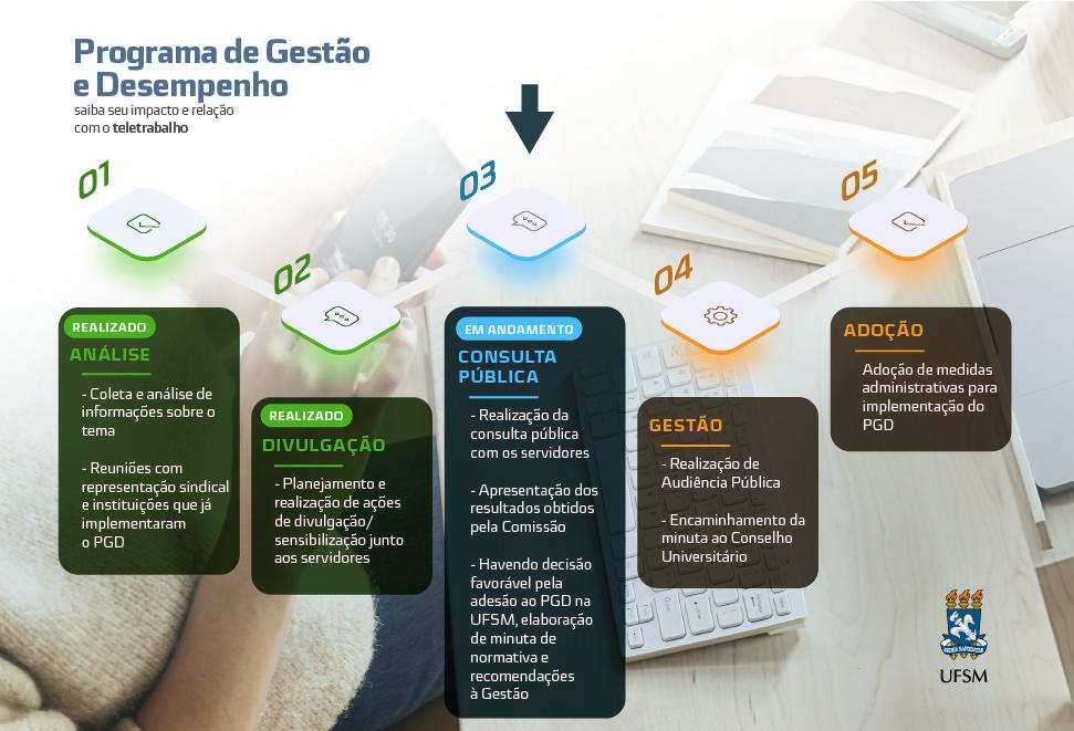 A instituição do PDG na Universidade Federal de Santa Maria foi avaliada preliminarmente pela Comissão designada pela Portaria de Pessoal UFSM N. 1.405 de 08 de junho de 2022, a qual foi composta por representantes do Gabinete do Reitor (GR), Pró-Reitoria de Gestão de Pessoas (Progep) , Associação dos Servidores da Universidade Federal de Santa Maria (Assufsm), Seção Sindical dos Técnicos de Nível Superior da UFSM (Atens) e Sindicato Nacional dos Servidores Federais da Educação Básica, Profissional e Tecnológica – SM (Sinasefe). A referida comissão atuou no período de 29/06/2022 a 31/10/2022, realizando a avaliação das normativas sobre o Programa de Gestão e Desempenho (PGD), orientando os servidores da Instituição sobre o assunto e subsidiando a atual gestão da UFSM sobre a possibilidade ou não de adesão ao Programa, bem como seus impactos. Considerando o trabalho desempenhado, especialmente, os resultados obtidos junto à consulta pública realizada com os servidores técnico-administrativos em educação da UFSM, a comissão temporária indicou à Gestão da UFSM que a adesão ao Programa de Gestão e Desempenho (PGD) deve ter continuidade na instituição.