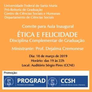 A Pró-Reitoria de Graduação (Prograd), em conjunto com o Departamento de Ciências Sociais da UFSM, está ofertando vagas para a disciplina “Ética e felicidade: lições da Filosofia Antiga para uma vida boa”. Ao todo, são disponibilizadas cinquenta vagas para alunos de todos os cursos de graduação da universidade.