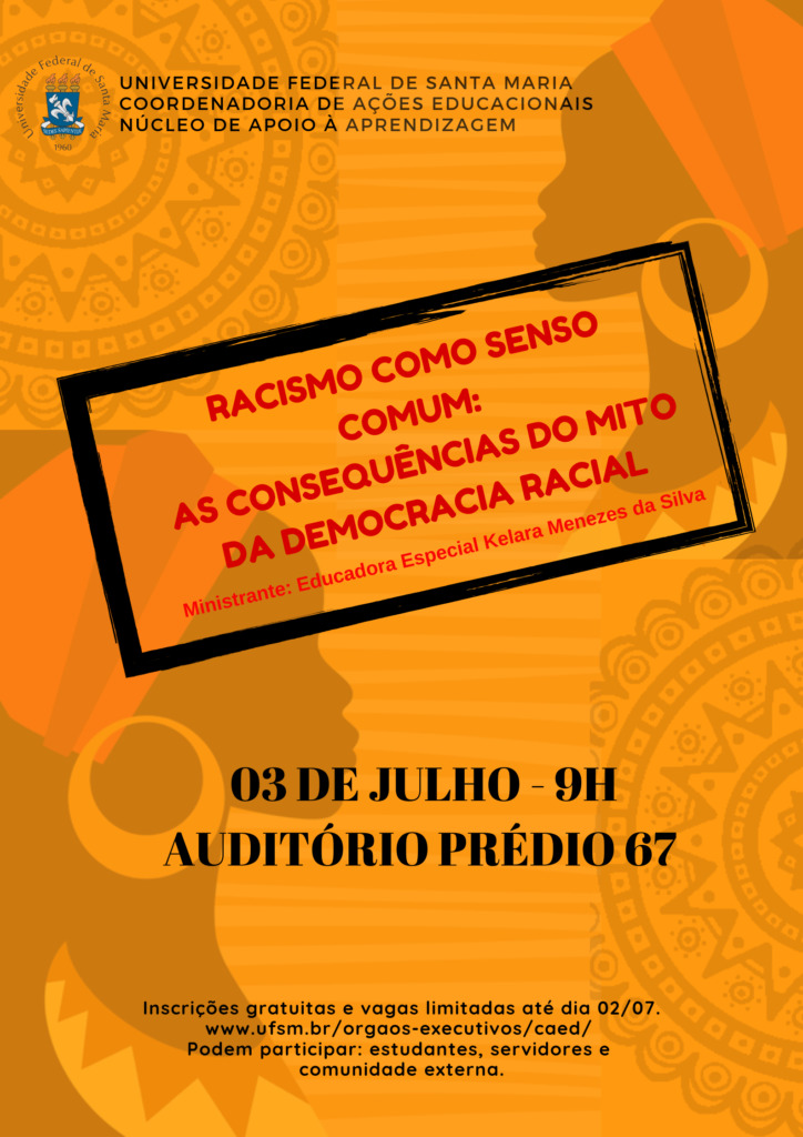 O Núcleo de Apoio à Aprendizagem da Coordenadoria de Ações Educacionais da UFSM (CAEd) divulga a abertura das inscrições para o Curso “Racismo como senso comum: as consequências do mito da democracia racial”. O evento acontecerá no dia 03 de julho, quarta-feira, das 09 horas ao meio-dia, no auditório do Prédio 67 da UFSM, localizado próximo ao Prédio 21.