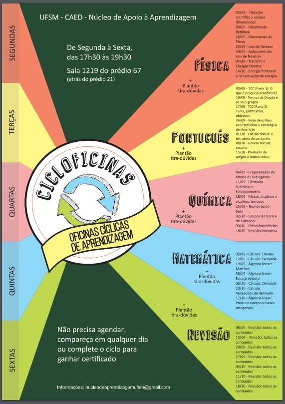 Pensando nisso, a Coordenadoria de Ações Educacionais (CAEd) e o Núcleo de Apoio à Aprendizagem organizaram oficinas de revisão para os estudantes de graduação da UFSM. O nome do projeto já é um trava-línguas desafiador: as Cicloficinas – Oficinas Cíclicas de Aprendizagem acontecerão nos meses de setembro e outubro, não sendo necessário inscrição prévia. Segundo o cronograma, elas ocorrerão de segunda a sexta-feira, das 17h30 às 19h30, na sala 1219 do Prédio 67, próximo ao Prédio 21.